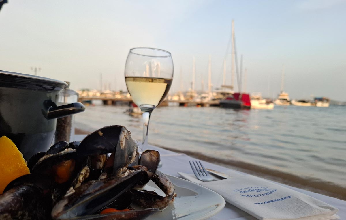 The waterfront area includes cafes, tavernas, playgrounds and public spaces that form the social centre of the town.